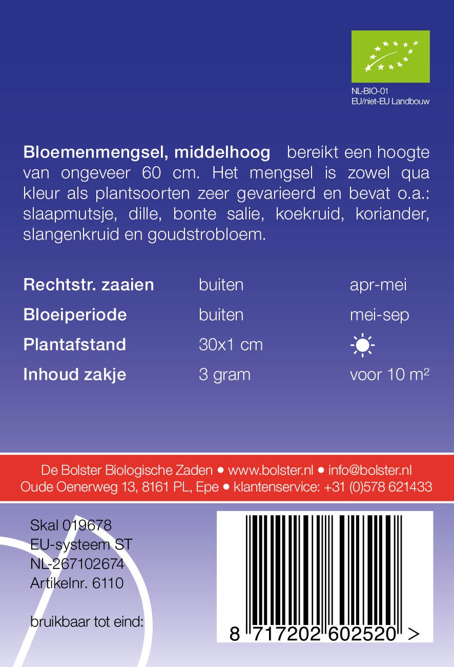 Bloemenmengsel is zeer gevarieerd. Het bevat eenjarige soorten zoals turkse drakenkop, slaapmutsje, koekruid en kleine lupine. Deze soorten bereiken een hoogte van ong. 60 cm. Eén zakje is voor circa 10m2, en de plantafstand bedraagt 30x1 cm.
