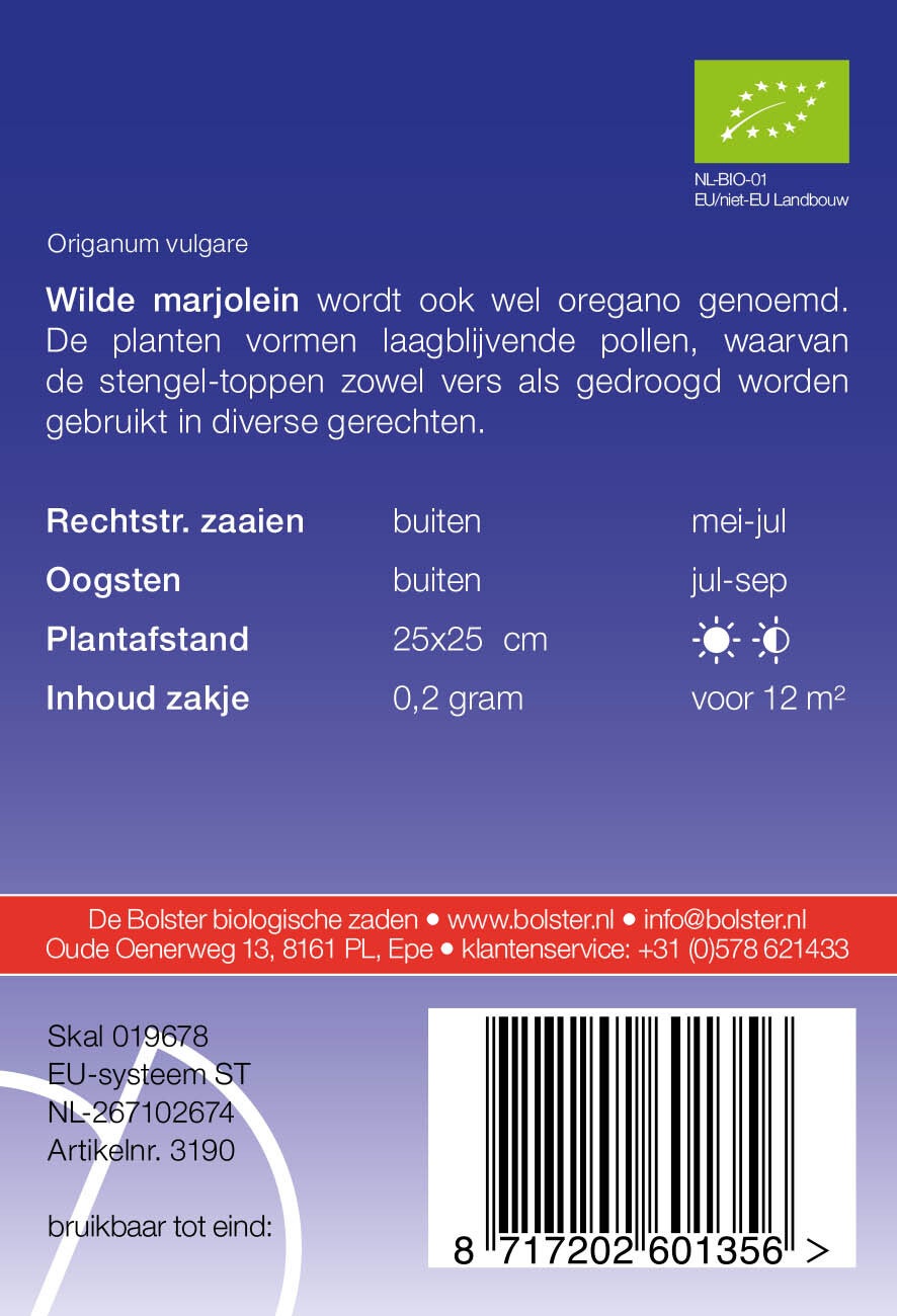 Wilde Marjolein' is beter bekend als Oregano. Oregano geeft planten met laagblijvende pollen. Zaaien binnen in april of buiten in mei. De stengeltoppen kunnen zowel vers als gedroogd gebruikt worden. Eén zakje is voor circa 30m2, en de plantafstand bedraagt 40x40 cm.